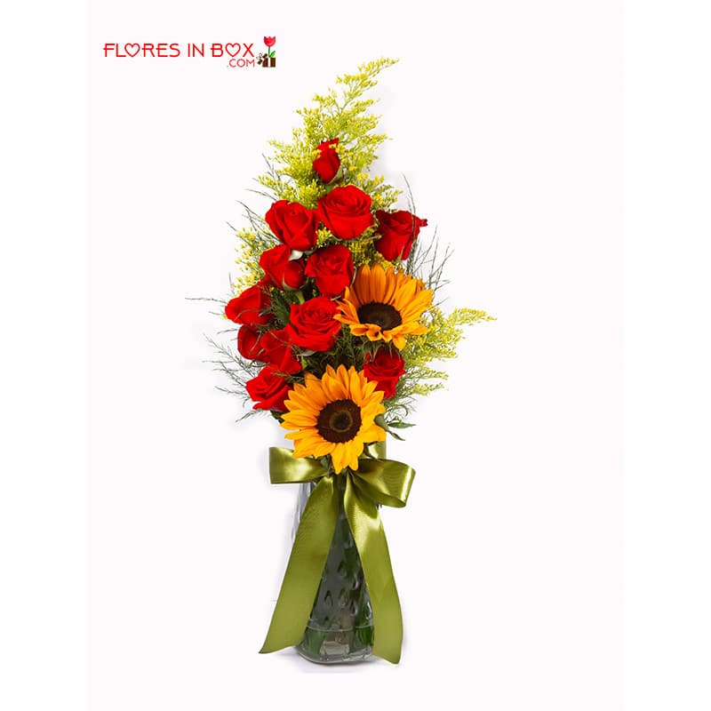Bello arreglo floral en base de viidrio de Rosas Rojas y Girasoles