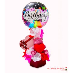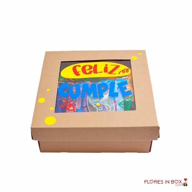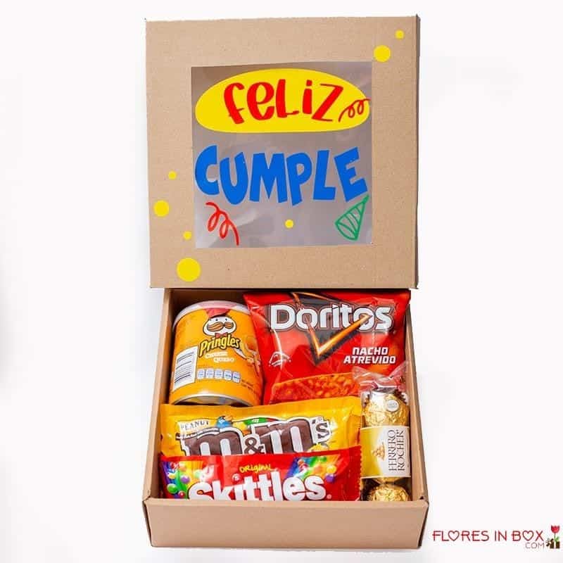Exquisita caja sorpresa de cumpleaños con Pringles, Chocolates Ferrero Rocher, M&Ms y Doritos.