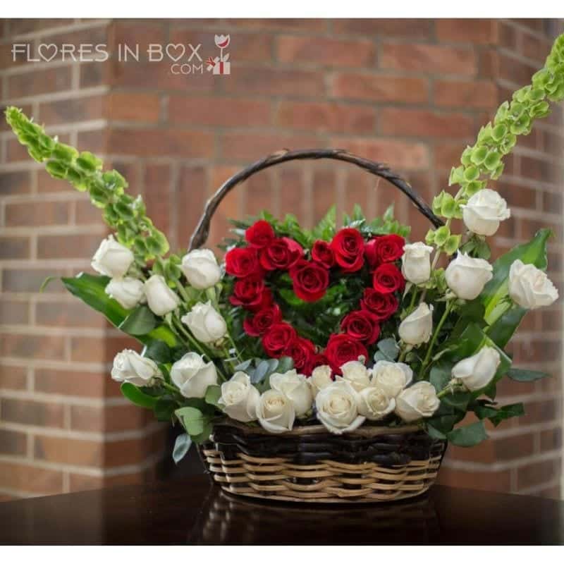 Elegante arreglo premium en una canasta de flores con un corazón de rosas rojas.