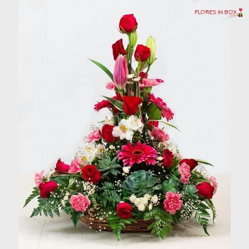 Arreglo premium con suculentas, rosas, gerberas, lirios y más sobre una canasta deluxe.