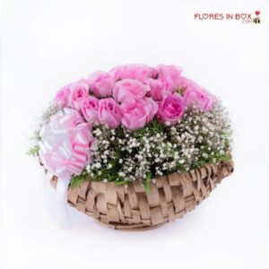 Precioso arreglo con lirios, rosas y más sobre una canasta de mimbre.
