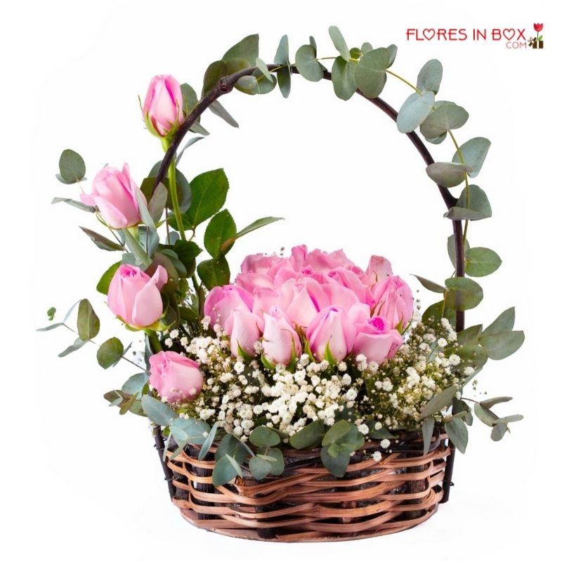 Linda canasta de mimbre con rosas rosadas.